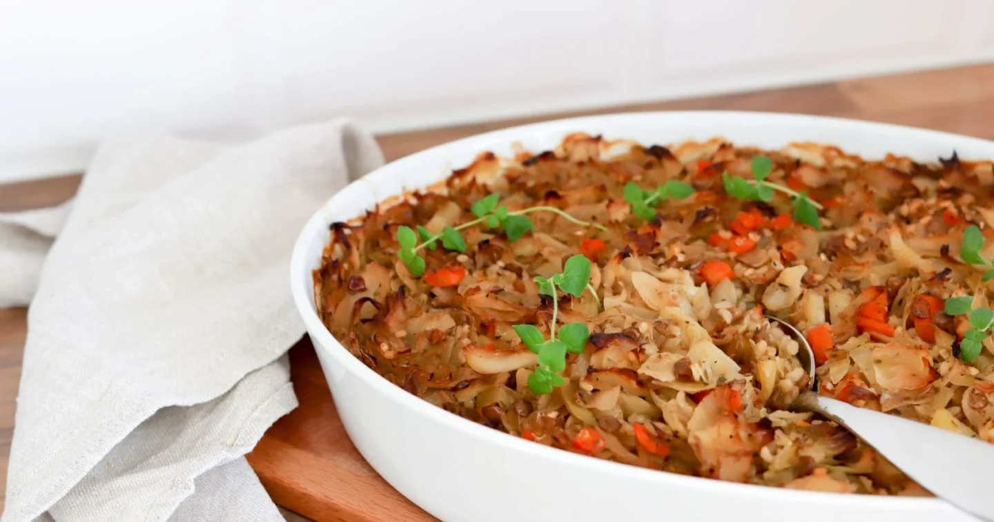 Kasvis-kaalilaatikko on vegaaninen ruoka, johon kätketään rouheita vihreitä linssejä. Ruoka on parhaimmillaan, kun se saa hautua pitkään uunissa, jolloin kaali pehmenee ja makeutuu.